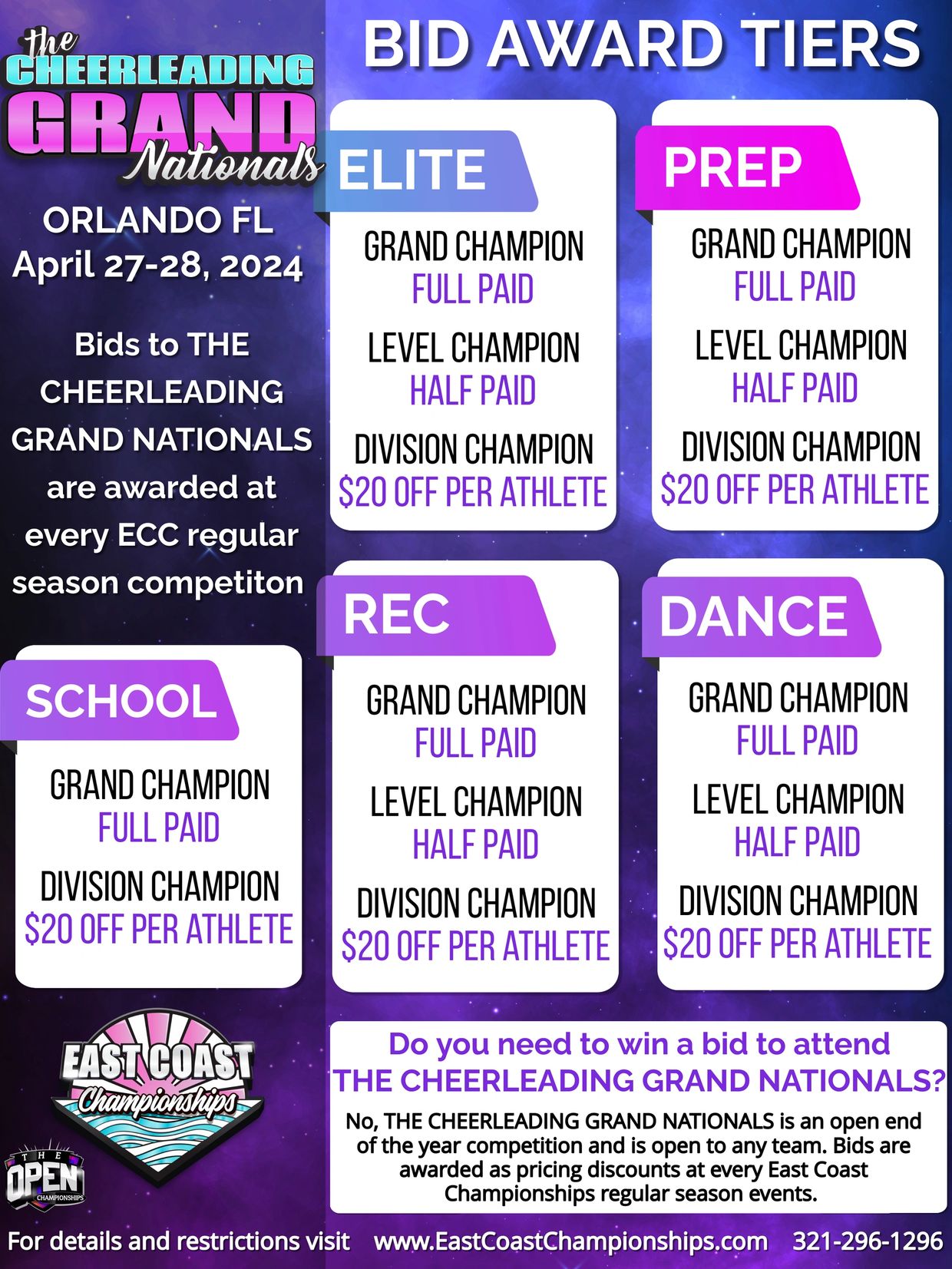 ALTHOUGH BIDS ARE OFFERED, THE CHEERLEADING GRAND NATIONALS IS AN OPEN EVENT AND BIDS ARE NOT REQUIRED TO ATTEND.